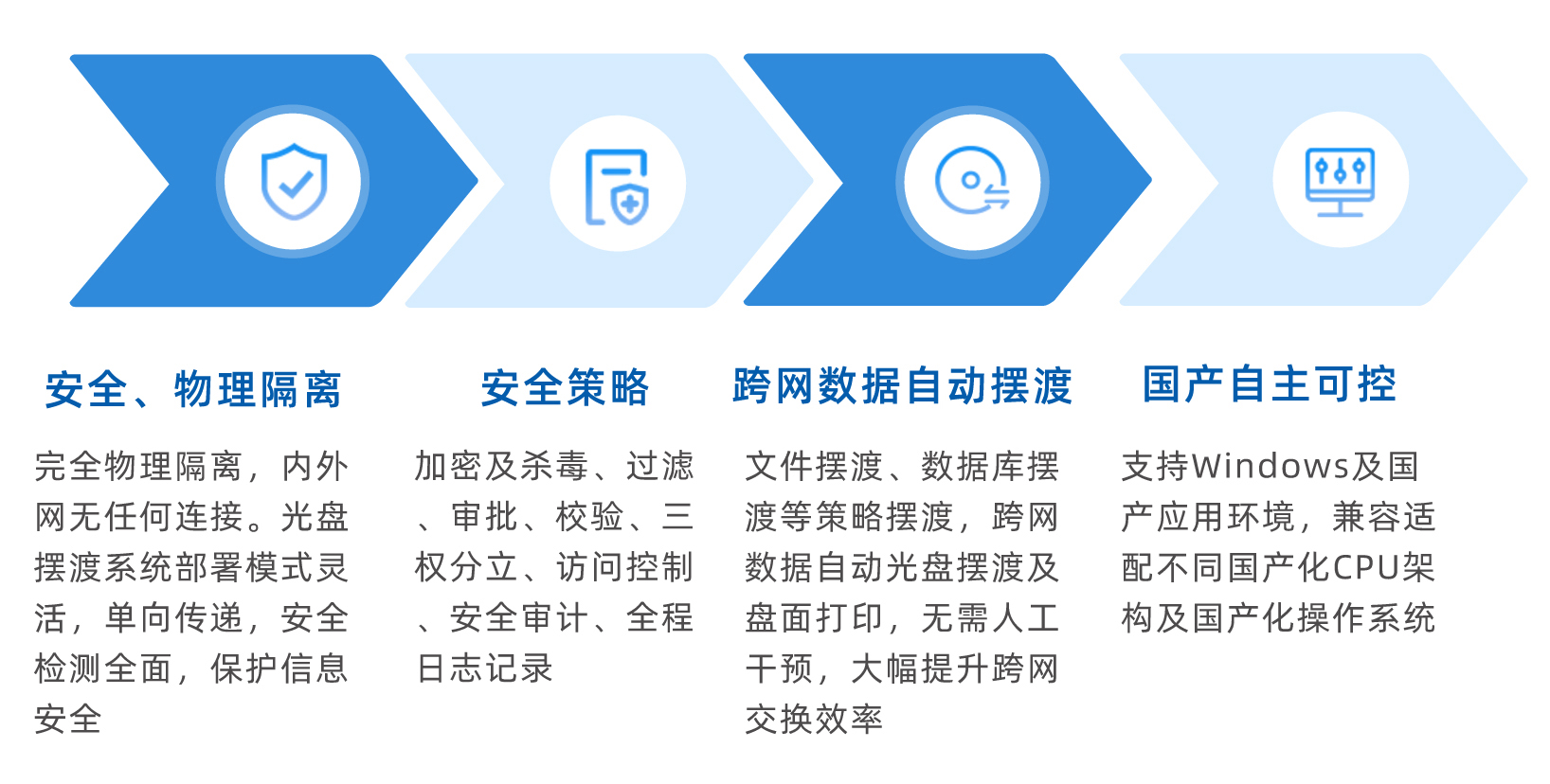 派美雅按需研制的光盘安全隔离与信息交换系统,应用不同等级网络之间数据跨网交换,集数据自动摆渡、用户管理、日志管理、三权管理、加密及杀毒、数据检查与过滤、校验、安全审计等功能于一体。采用模拟人手工操作光盘方式,在保持物理隔离的条件下,安全合规地实现网间数据单向传输稳定可靠,网间信息数据交换,网间信息系统数据库及文件同步。支持审计系统厂商、电子文件交换系统等多个业务、档案系统厂商无缝对接,实现全自动化数据安全单向导入/导出。