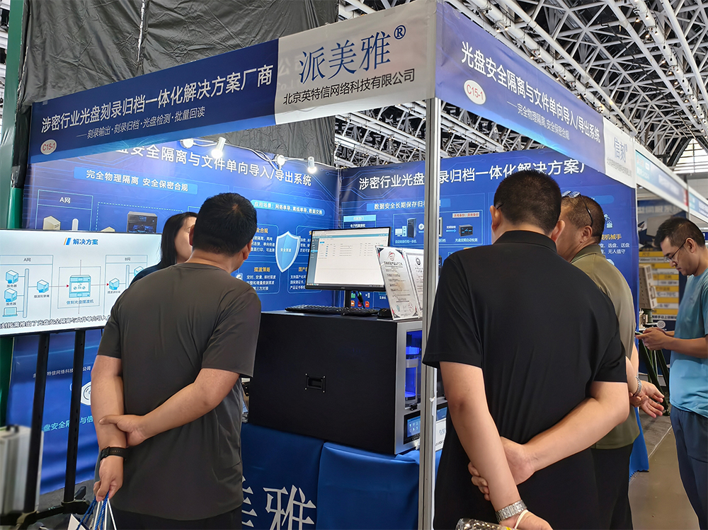 作为深耕涉密行业领域20年的领先企业,北京英特信携涉密行业全自动光盘刻录打印归档系统、光盘安全隔离与文件单向导入/导出系统、安全生产音视频刻录归档、智能光盘库、军采开评标音视频文件归档、档案长期归档、预先刻录暂存、光盘审计刻录输出与行业解决方案亮相本次展会,充分展示了在数据光盘安全摆渡、光盘刻录打印、光盘存储、归档检测管理应用领域的综合实力,现场精彩纷呈,获得各行业高度关注与认可。