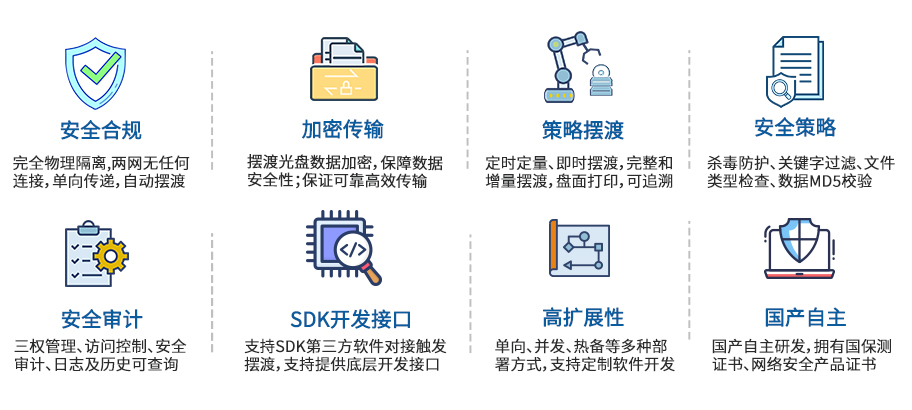 不仅如此,公司所研制数据光盘安全摆渡产品,避免了人工操作带来的不可控因素,实现了数据摆渡过程完全自动,无需人工干预,随时响应跨网交互需求,大幅提升跨网摆渡业务效率。真正满足实际业务需求。