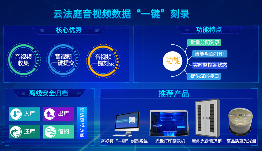 创新实施方案部署配置了派美雅自主研发的软硬件一体化音视频“一键”刻录系统、全自动光盘打印刻录机产品,搭配智能光盘管理柜、高品质企业级可打印光盘实现了一站式云法庭音视频“一键”刻录归档管理方案,针对用户需求场景,支持为用户提供定制开发。