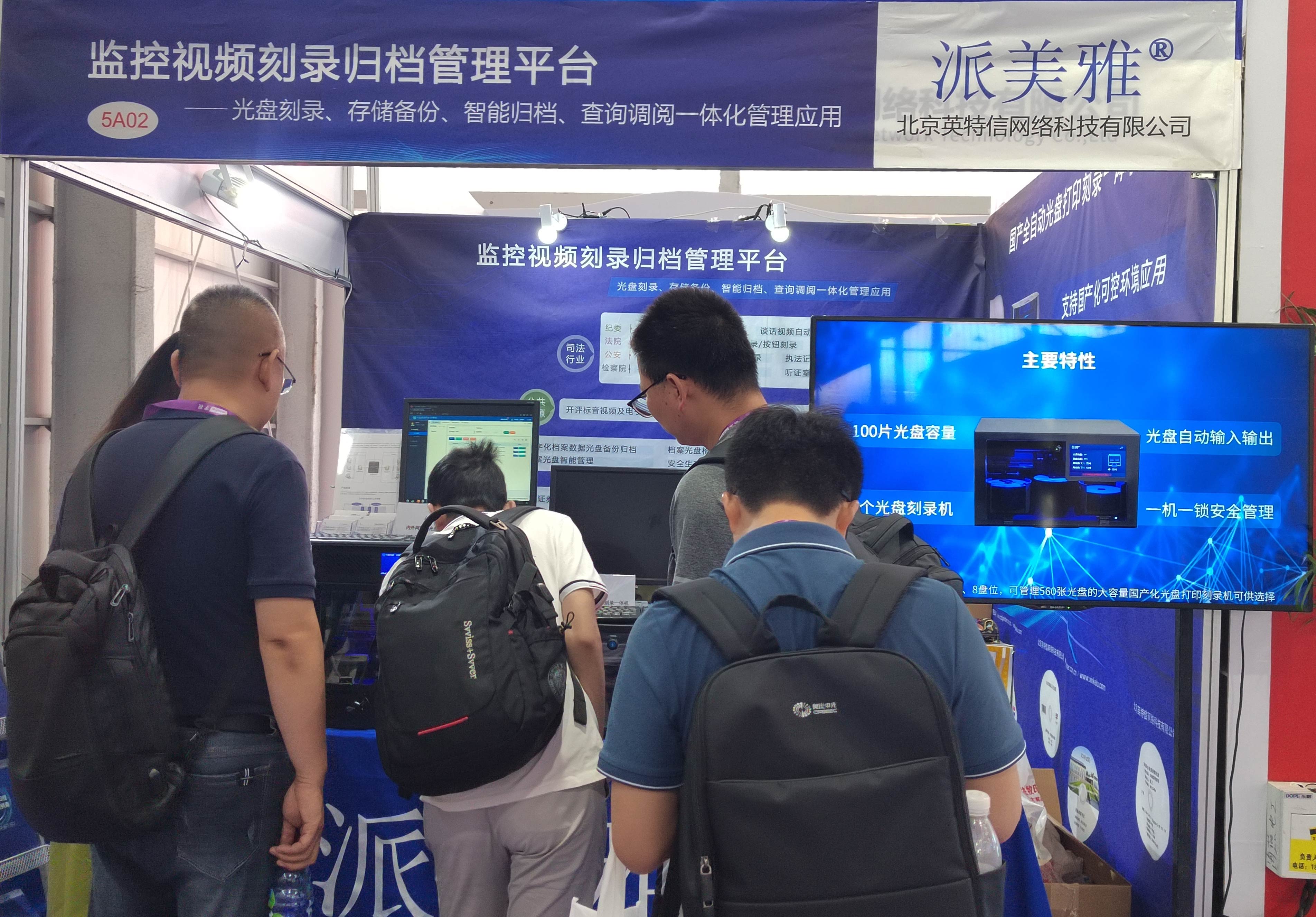 北京英特信网络科技有限公司旗下品牌为“派美雅”、“信刻”,专注于光盘打印、刻录、数据分发;存储备份;智能光盘归档管理;数据摆渡等智能产品各行业应用近20年,集研发、生产、销售、售后四位一体化的专业厂商受邀参加。携全自动光盘打印刻录机、监控视频刻录归档管理平台、内外网数据光盘摆渡系统、智能光盘管理柜、光盘检测刻录一体机、专业档案级光盘等创新产品应用与解决方案精彩亮相,全面展示在公检法纪委、军工、部队、政府机关、科研院所、公共资源交易中心、档案、金融等领域新技术、新产品应用,为行业发展注入新动能,吸引众多现场观众纷纷向前沟通交流。